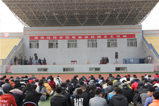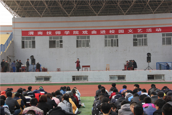 12月2日,學(xué)院特邀渭南市黃土地演藝公司戲曲演唱隊,在學(xué)院操場為全體師生進(jìn)行專場演出。演出的劇目有紅燈記《打不進(jìn)豺狼決不下戰(zhàn)場》、洪湖赤衛(wèi)隊《娘的眼淚似水淌》、《三滴血》選段及傳統(tǒng)折子戲《三娘教子》等,名家名劇,異彩紛呈,師生熱情高漲,深受教育。學(xué)生處精心組織,班主任到場配合,秩序井然,活動達(dá)到預(yù)期效果。 戲曲進(jìn)校園活動是我市創(chuàng)建全國文明城市的一項(xiàng)重要內(nèi)容,也是弘揚(yáng)傳統(tǒng)文化,傳承戲曲藝術(shù)的有效途徑。此項(xiàng)活動將長期堅持,有效推動。