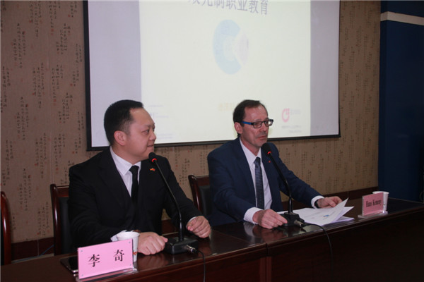 3月27日,由陜西省歸國華僑聯(lián)合會(huì)舉辦的“僑·說――2017海外入陜國際文化系列講座”進(jìn)校活動(dòng)在我院舉行,活動(dòng)特邀請(qǐng)德國中小企業(yè)聯(lián)合會(huì)總干事、市場調(diào)研咨詢中心主任漢斯·凱米尼先生來院作題為《德國技術(shù)培訓(xùn)及職業(yè)教育系統(tǒng)的發(fā)展現(xiàn)狀》的講座。省僑聯(lián)副主席、秘書長尚小紅,渭南市僑聯(lián)黨組書記、主席劉建軍,市人社局副局長馬建成、市外專局局長趙立偉、學(xué)院院長曲志勇、院黨委副書記李東旺等出席活動(dòng),學(xué)院教師代表及學(xué)生代表參加了報(bào)告會(huì)。 漢斯·凱米尼先生分別從德國職業(yè)教育的發(fā)展歷史、構(gòu)成、專業(yè)設(shè)置及運(yùn)作模式、與中國職教的平行教育模式和中德技術(shù)培訓(xùn)及職業(yè)教育的合作與展望等五項(xiàng)內(nèi)容展開宣講。“僑說”講座,是聚僑之力,匯說中西,服務(wù)陜西之意。也是省僑聯(lián)開展海外“引才引智”的一項(xiàng)舉措,旨在旨在通過此項(xiàng)活動(dòng)牽線搭橋,宣傳陜西,吸引更多的海外高層次人才回陜、來陜開展學(xué)術(shù)交流,創(chuàng)新創(chuàng)業(yè),以才引才,投資發(fā)展。