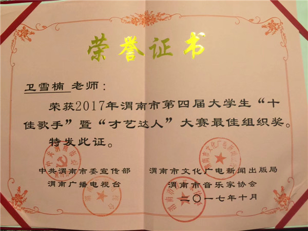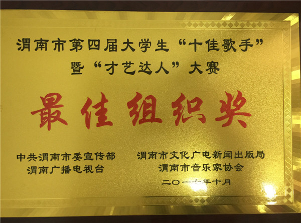 近日,由中共渭南市委宣傳部、市文化廣電新聞出版局等部門(mén)主辦的“中國(guó)夢(mèng)·我的夢(mèng)——青春飛揚(yáng)放飛夢(mèng)想”渭南市第四屆大學(xué)生“十佳歌手”暨“才藝達(dá)人”大賽已圓滿落幕。我院團(tuán)委在本屆大賽中組織得力,成績(jī)優(yōu)異,受到渭南市委宣傳部、市文化廣電新聞出版局等部門(mén)的表彰。院團(tuán)委衛(wèi)雪楠老師獲得大賽最佳組織獎(jiǎng)個(gè)人獎(jiǎng);院團(tuán)委獲得大賽最佳組織獎(jiǎng)。