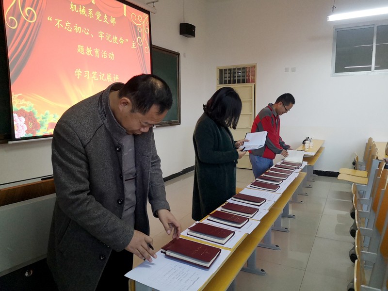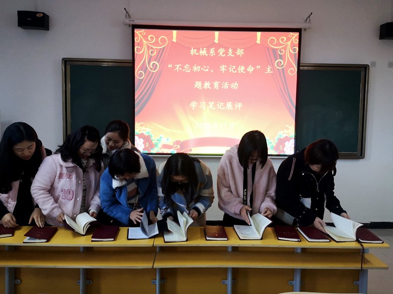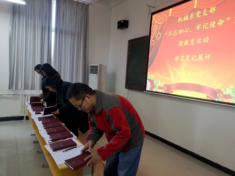 11月13日,機(jī)械系黨支部開展“不忘初心、牢記使命”主題教育黨員學(xué)習(xí)筆記展評(píng)交流活動(dòng);顒(dòng)集中展評(píng)了支部黨員在開展主題教育以來的個(gè)人自學(xué)學(xué)習(xí)筆記。展評(píng)中,大家依次對(duì)參展筆記進(jìn)行點(diǎn)評(píng)和學(xué)習(xí),相互借鑒交流,達(dá)到了相互促進(jìn)、共同學(xué)習(xí)、以查促學(xué)的目的。