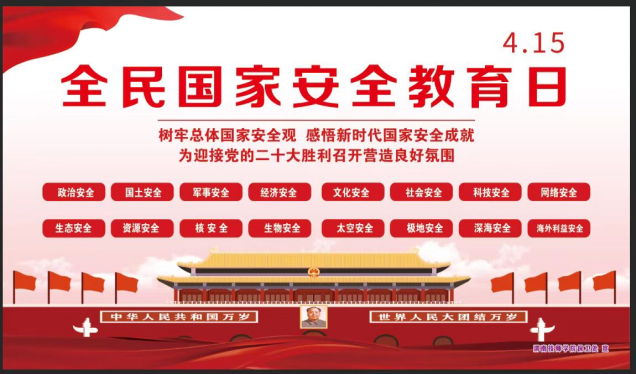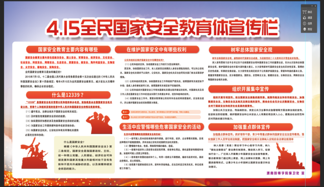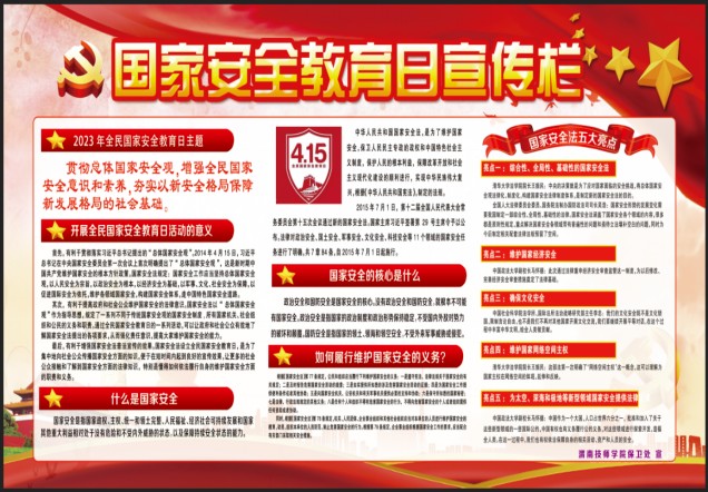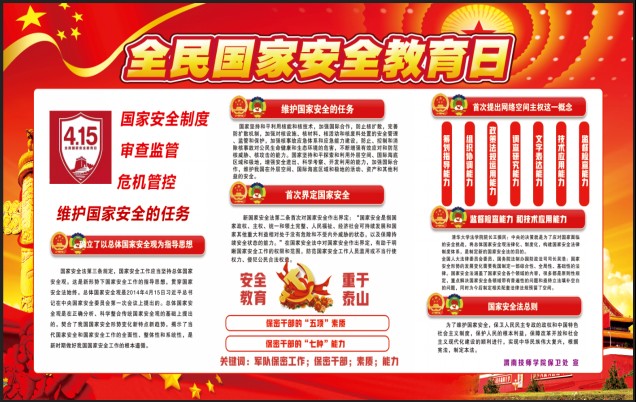 為了讓學生更直觀的學習了解國家安全知識,保衛(wèi)處制作“4•15全國全民國家安全教育”宣傳欄一個,制作宣傳展板四塊,在校園進行為期一周的宣傳展覽。