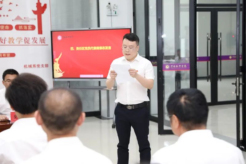 本次活動在莊嚴(yán)的國歌聲中拉開序幕,機械系黨支部書記史盼盼匯報了本次活動的籌備情況,宣讀了黨員責(zé)任區(qū)劃分方案,參會領(lǐng)導(dǎo)現(xiàn)場為責(zé)任區(qū)黨員進(jìn)行了授牌,責(zé)任區(qū)黨員代表做表態(tài)發(fā)言。活動中,學(xué)院黨委書記曲志勇做了總結(jié)講話,高度評價了此次主題黨日活動,他指出本次支部活動形式新、儀式感強,效果好,黨員風(fēng)采欄黨員踐行承諾和黨員責(zé)任區(qū)的劃分,充分展現(xiàn)了機械系黨支部黨員的精神風(fēng)貌,也是機械系黨支部全體黨員干部積極踐行“黨建引領(lǐng)抓教學(xué),抓好教學(xué)促發(fā)展”的具體體現(xiàn)。他希望機械系黨員干部要以此次活動為契機發(fā)揮好黨員干部帶頭引領(lǐng)示范作用,推動機械系黨建工作和教學(xué)工作邁上新臺階。