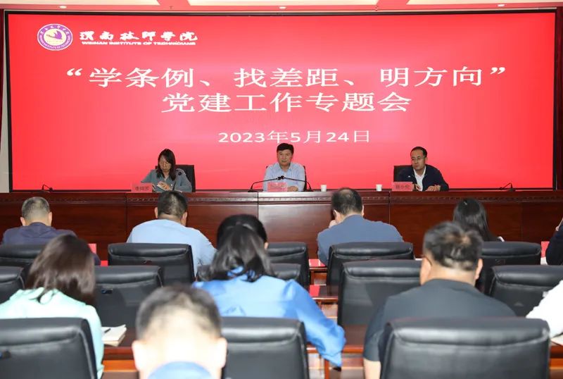 為深入學習貫徹習近平新時代中國特色社會主義思想和黨的二十大精神,全面落實全市組織部長會議精神和“三個年”活動要求,5月24日下午,渭南技師學院召開“學條例、找差距、明方向”黨建工作專題會,黨委書記曲志勇主持會議并講話,黨委委員、紀委書記蔡小倫、組織人事處處長、各黨支部書記和支部委員參加了此次會議。