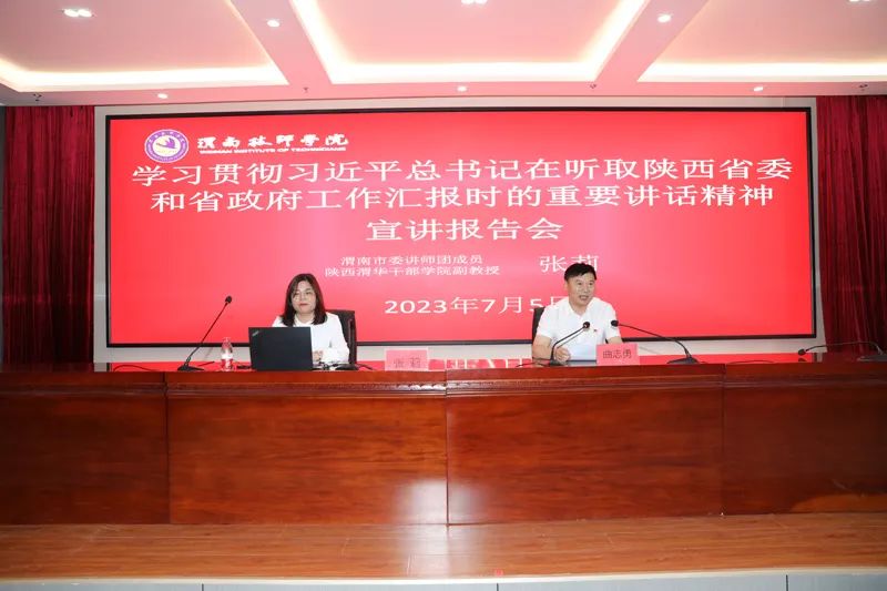7月5日下午,我院邀請(qǐng)陜西渭華干部學(xué)院培訓(xùn)組組長(zhǎng)、副教授張莉來(lái)院作題為《勇立潮頭 發(fā)揮示范 奮力譜寫中國(guó)式現(xiàn)代化的陜西新篇章--貫徹落實(shí)習(xí)近平總書記來(lái)陜重要講話精神》宣講報(bào)告。報(bào)告會(huì)由黨委書記曲志勇主持,學(xué)院領(lǐng)導(dǎo)班子成員,副科及以上干部、各支部支委、各教研組組長(zhǎng)、全體思政課教師參加報(bào)告會(huì)。
